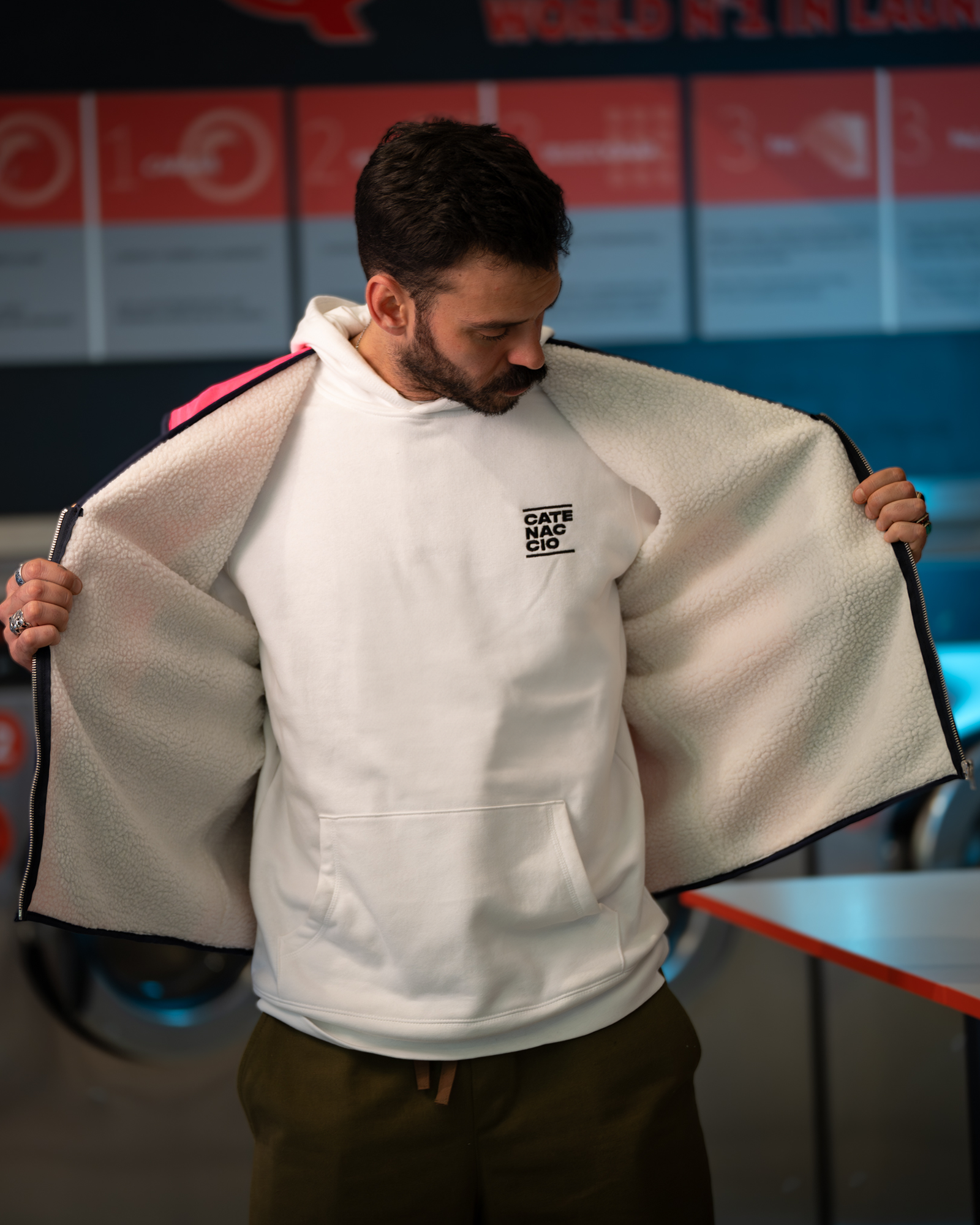 De corte recto y cuello en pico, forro interior de borreguito suave, cierre de cremallera y bolsillos frontales integrados. En la espalda, el dorsal número 3.